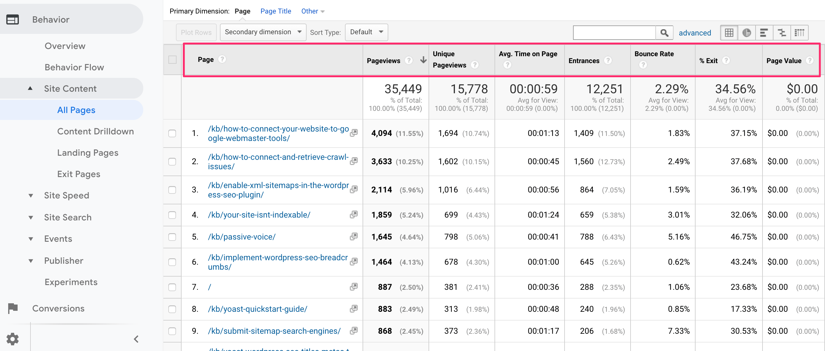 Sessions tell you more about how many sessions started with page X. You can use this metric to see how popular and important the landing page is. But it gets more interesting. Bounce Rate which in this case also means Exit page because this is the percentage of people that didn’t do anything after landing on page X.