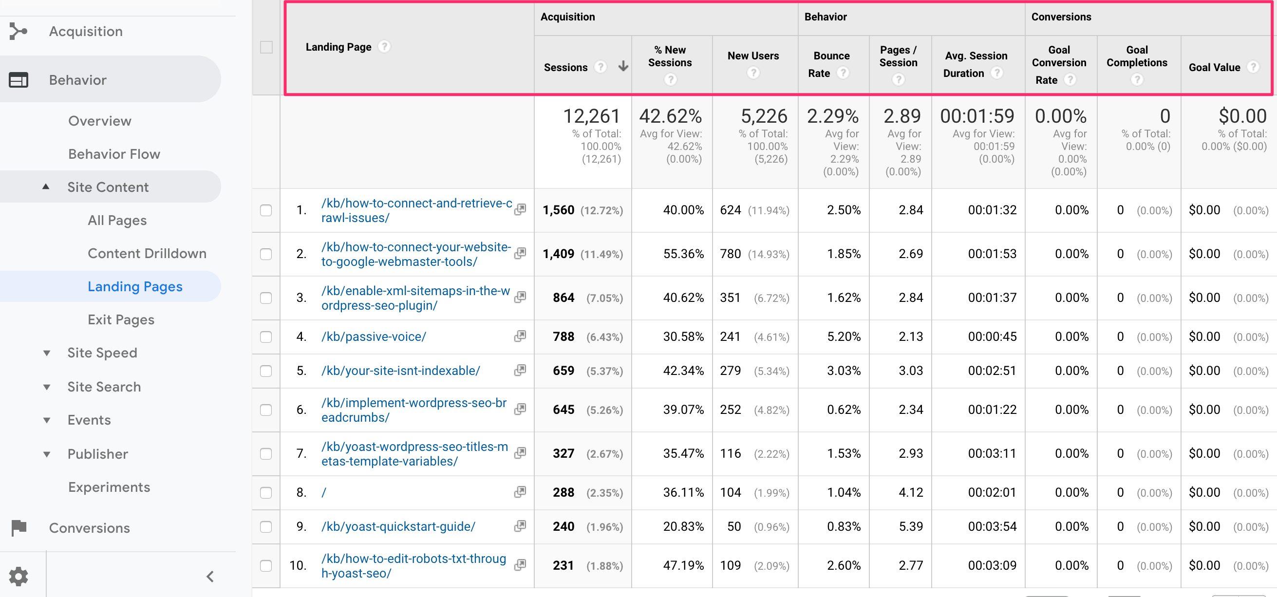 The landing page report is an audience insights report if you ask me. It contains information about what kind of pages make people click. Information about what made them decide to visit your website. And if you discover differences per source, you can adjust your marketing campaigns per source. Customizing the content of the newsletter based on what worked before. Optimizing your SEO because you know what kind of keywords your page fits best in search results. Awesome stuff!