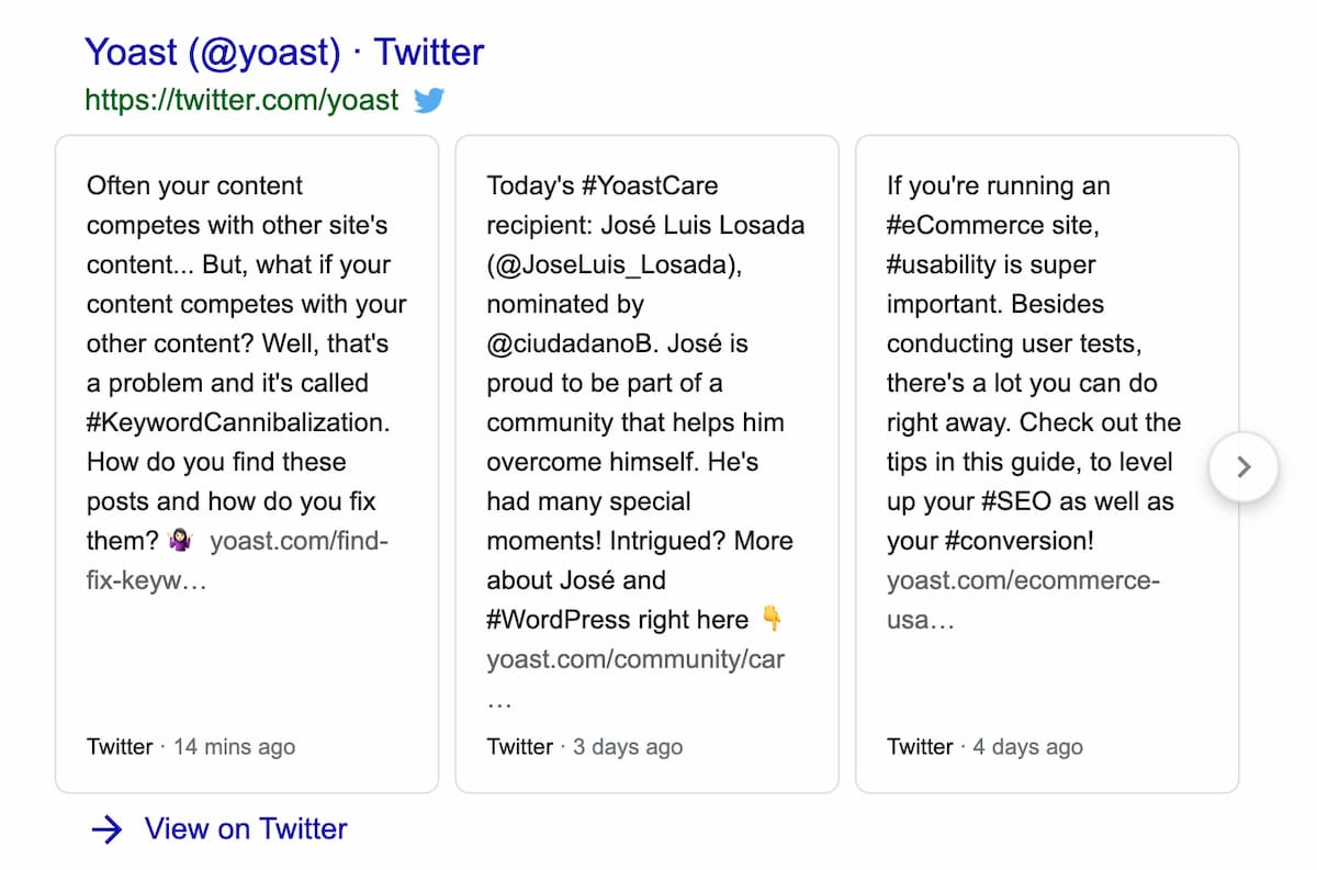 What we think is really cool is how Google regularly show an account’s latest tweets, right up there between other search results. Here’s an example of a so-called tweet carousel that shows when you search Google for [yoast].
