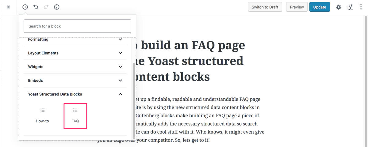 Since this is only an introduction to FAQ Schema, there are loads more properties to find on Schema.org. While not everything is available in Yoast SEO structured data content blocks, there’s a chance we’ll add some of those soon. You can always build on the groundwork that Yoast SEO lays down for you.