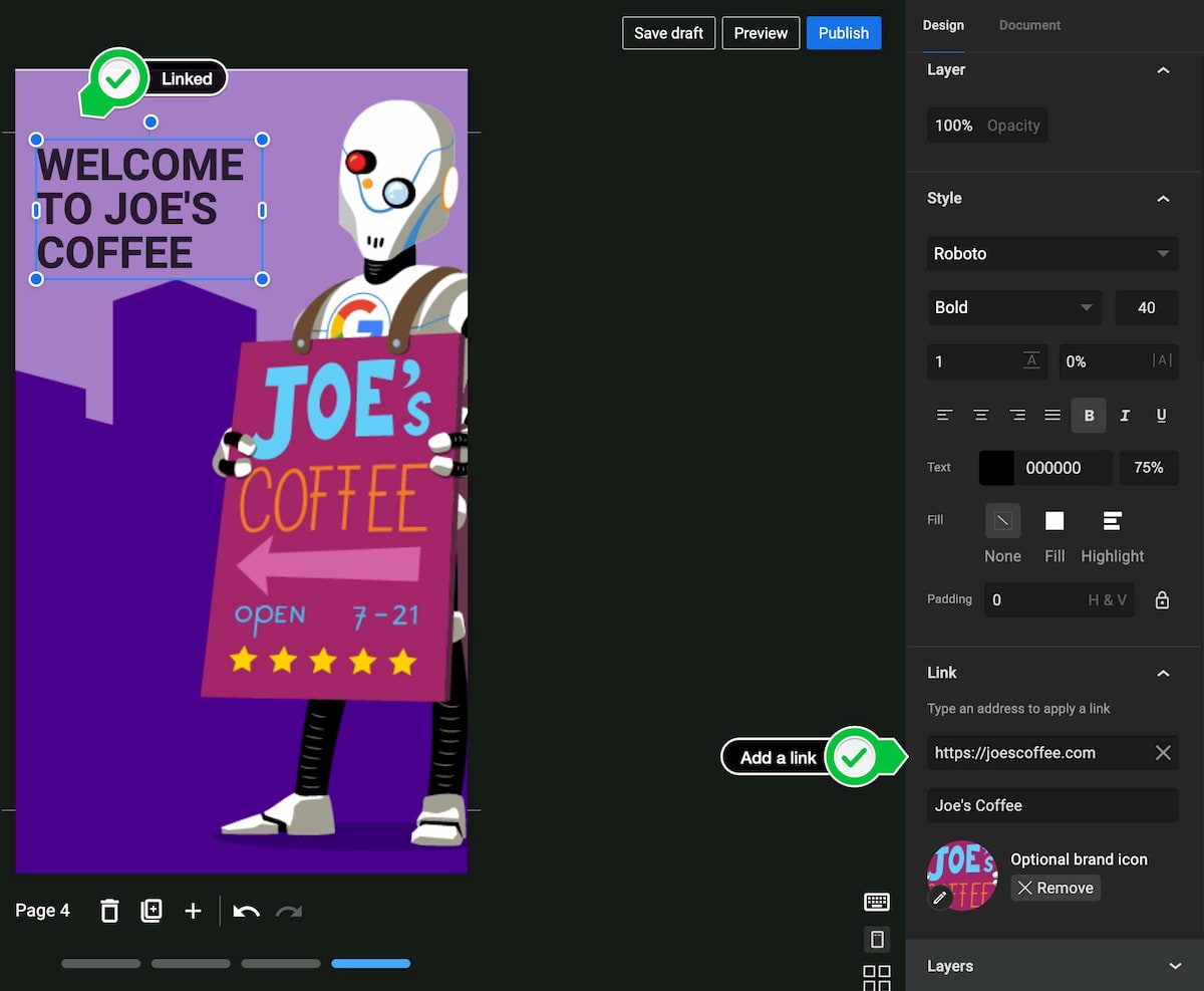 One of the cool things of Web Stories is that you can freely link out to your own content. Simply click on an element and add a link. Don’t overdo it, keep the number of links limited.