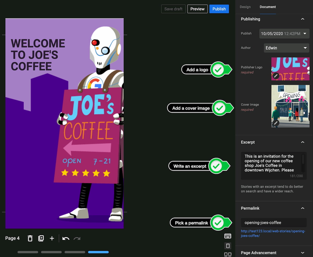 Once you’ve finished your web story, test it by clicking Preview. Before you hit Publish, you need to fill in some metadata to improve the story. You need this to have a valid web story according to Google. Click Document and fill in the logo, cover image, excerpt and pick a good permalink. Ready? Publish your story! The Web Stories plugin will ask you if you want to make a new post for this story. If you do, click the button and a new post will open with your story embedded in it.