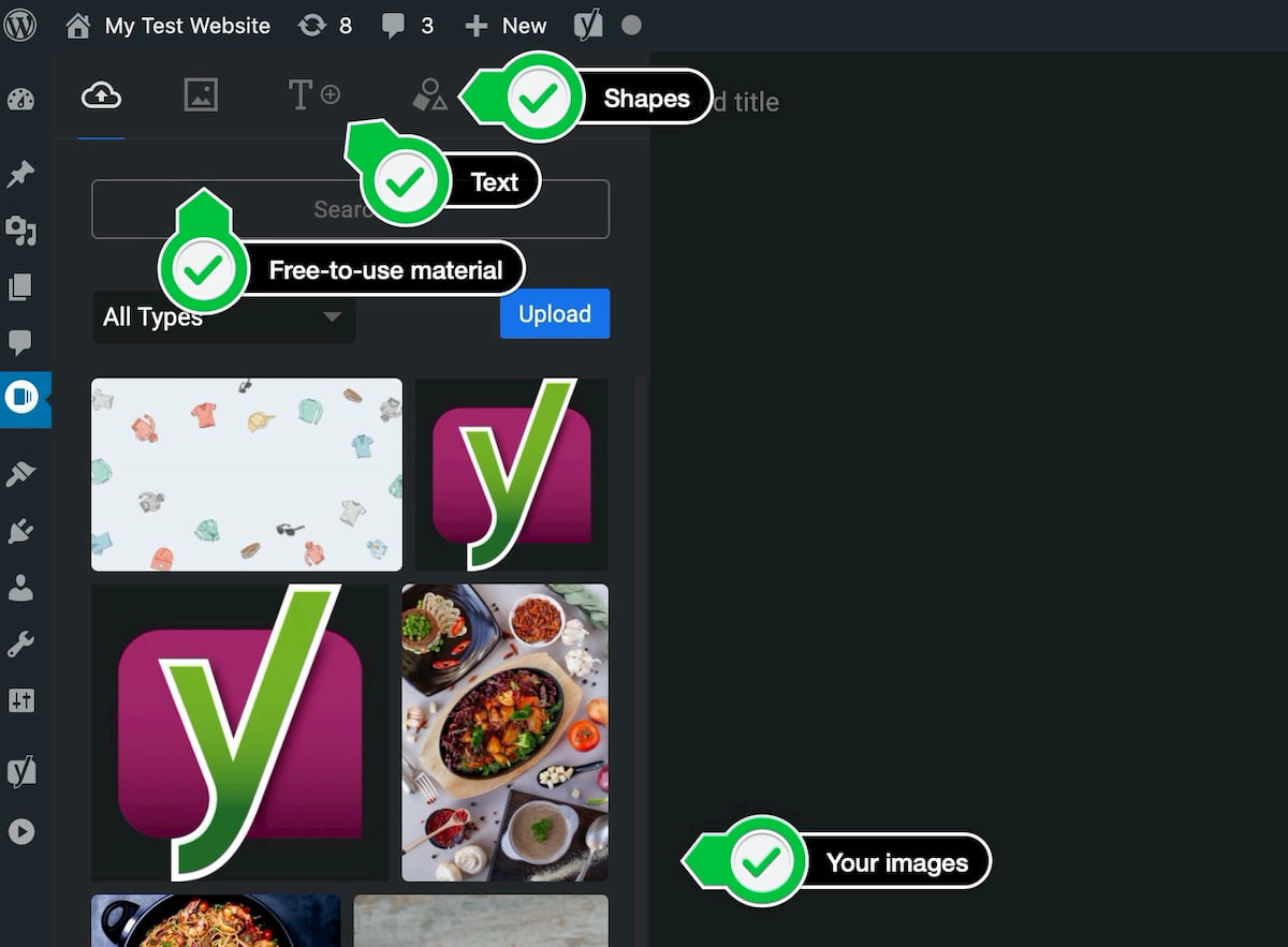If you made a new story, the interface opens with a blank template. On the left-hand side you can see the assets manager with images you’ve uploaded, and material you can use in your story. The T icon opens the text tab and triangle opens shapes.