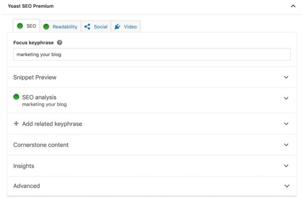 Here, we’ll be focusing on the SEO and readability analysis. But we’ll also have a quick look at the Social tab and the Cornerstone content section because it’s important to use those correctly when you’re optimizing your post or page.