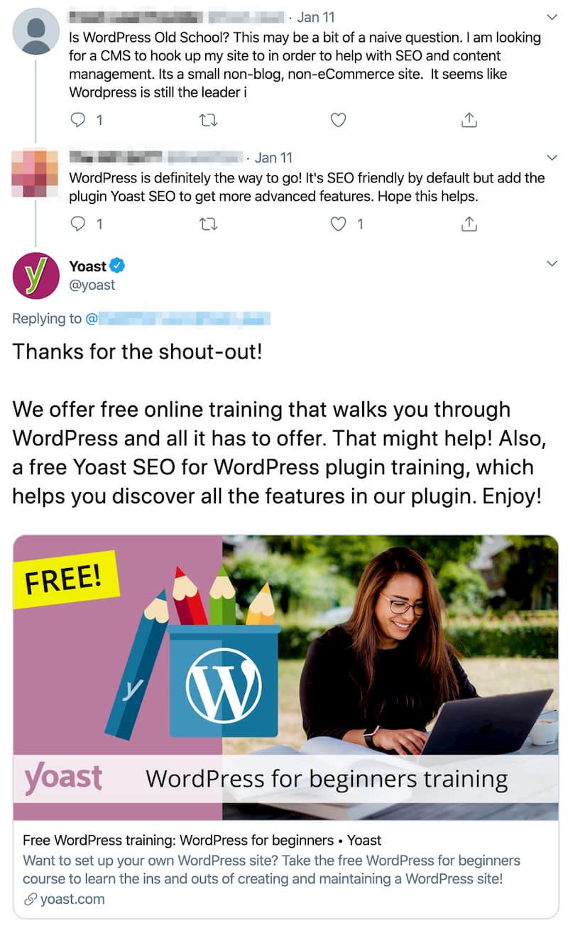 The latter could be a great way to grow your brand awareness. Here’s an example of where someone mentioned Yoast SEO without tagging @yoast. We weren’t even mentioned at all, in the original tweet. For us, responding to this is a great way to reach more people and spread even more SEO knowledge.