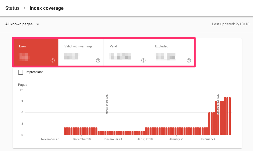 It seems that you can find some crawl errors in the new index coverage tag but if we look at our account, we don’t see all crawl errors in the new version. This means that it’s important to check your crawl errors still in the old version of GSC. When you’ve fixed a crawl error you can mark it as fixed. The crawl stats aren’t included yet so you can find those stats in the old version.