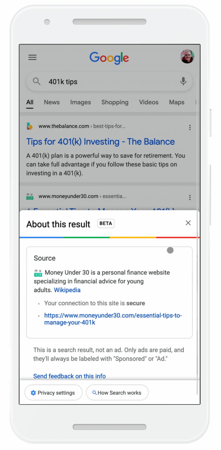 About a week ago, Google launched a quick way to learn more about your search results. They’re now giving (mobile) users the option to learn more about a source before they go to the actual site. In the example, the search results now show three dots in the top right corner of every search result. When you click on them, a popup shows you more information about the search results and company.