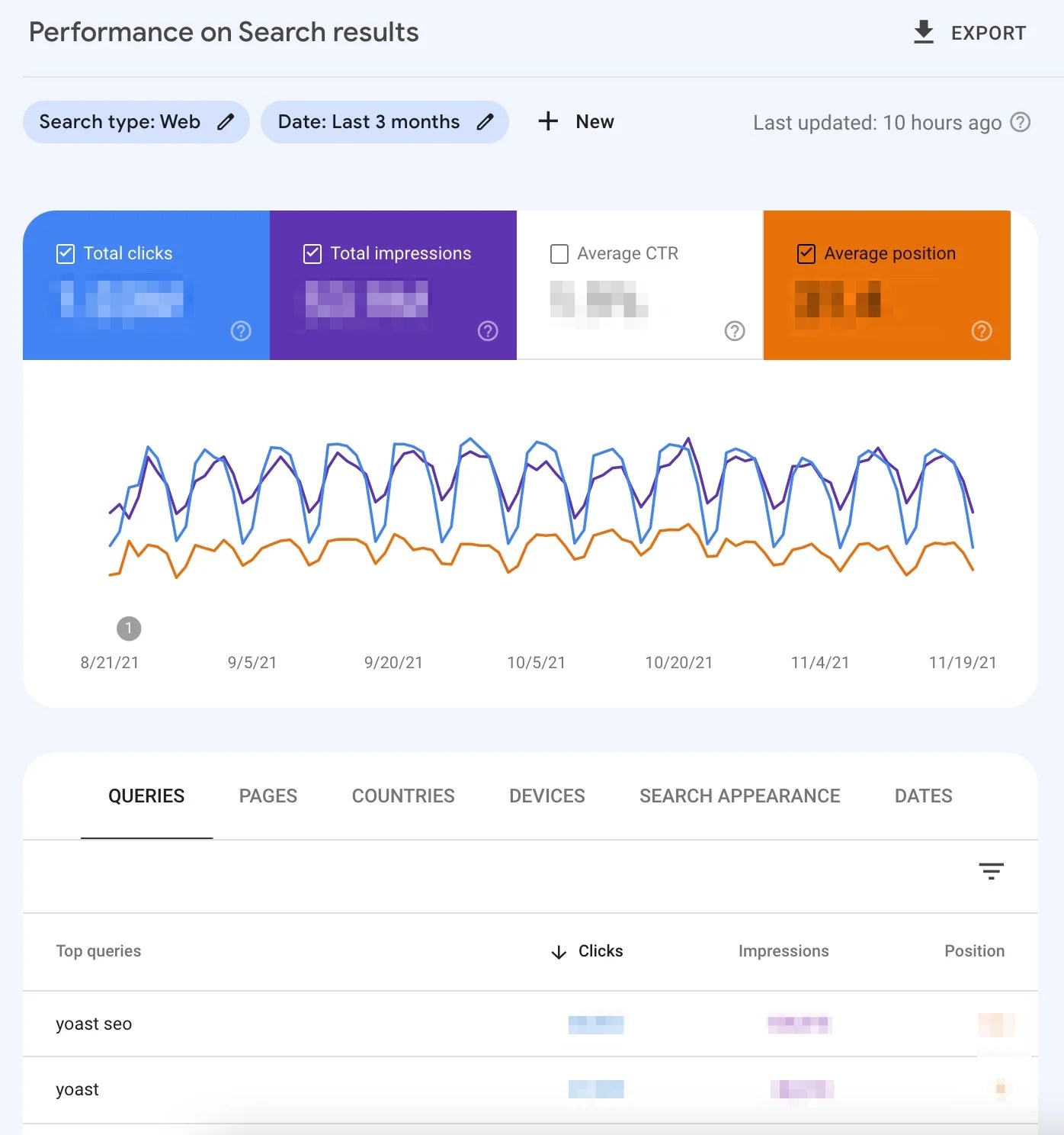 To start exploring the queries your site is ranking with, open Google Search Console and click on ‘Search results’ (under ‘Performance’) in the menu on the left-hand side. Right away, you’ll see a list of your site’s top-performing queries from the last 3 months. If you want to see your search performance over a different time frame, you can easily click on the filters near the top of the screen to edit this.