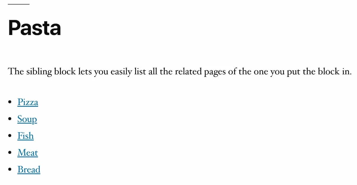 You can add the Siblings block to any of the subpages to list the siblings of the page you’ve added it to. So, if you add it to the pasta page, it’ll automatically list the related pages, in this case pizza and soup.