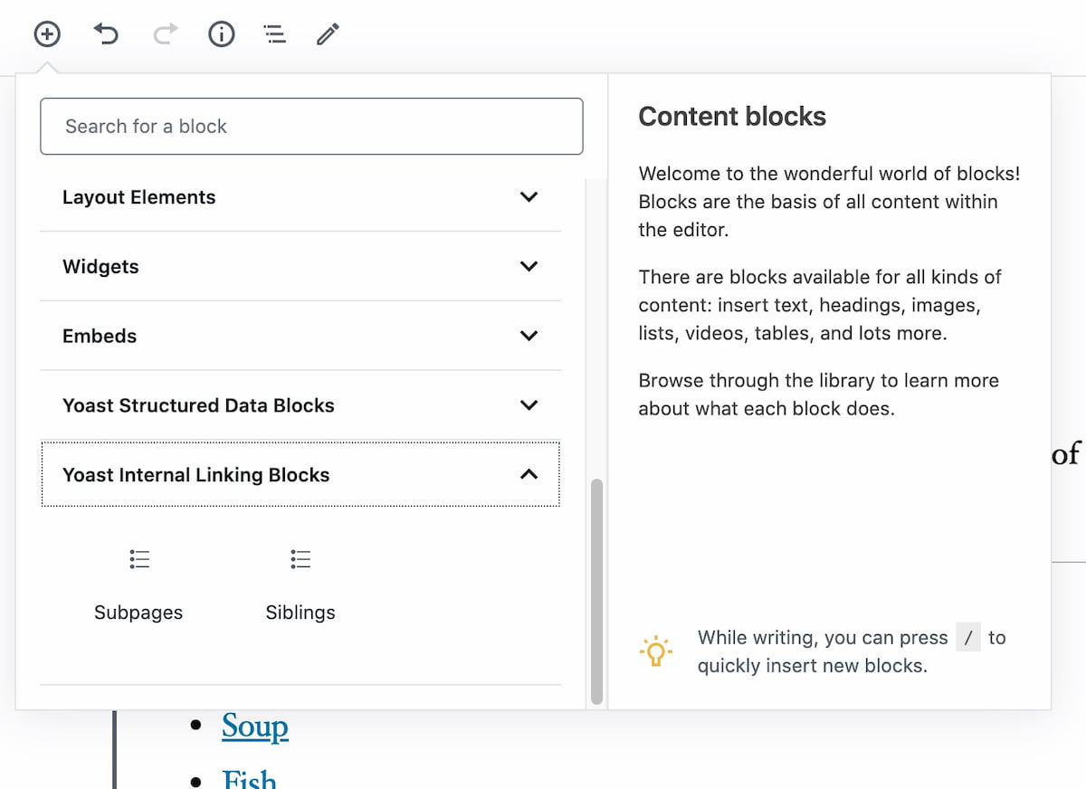 We all know internal linking is very important as it is helps you build your site structure, making your site easier to digest for both humans as well as machines. We have several tools that help you improve your internal linking and today, we’re adding two internal linking blocks for the block editor that can help you improve it even further. Meet the Subpages block and the Siblings block!