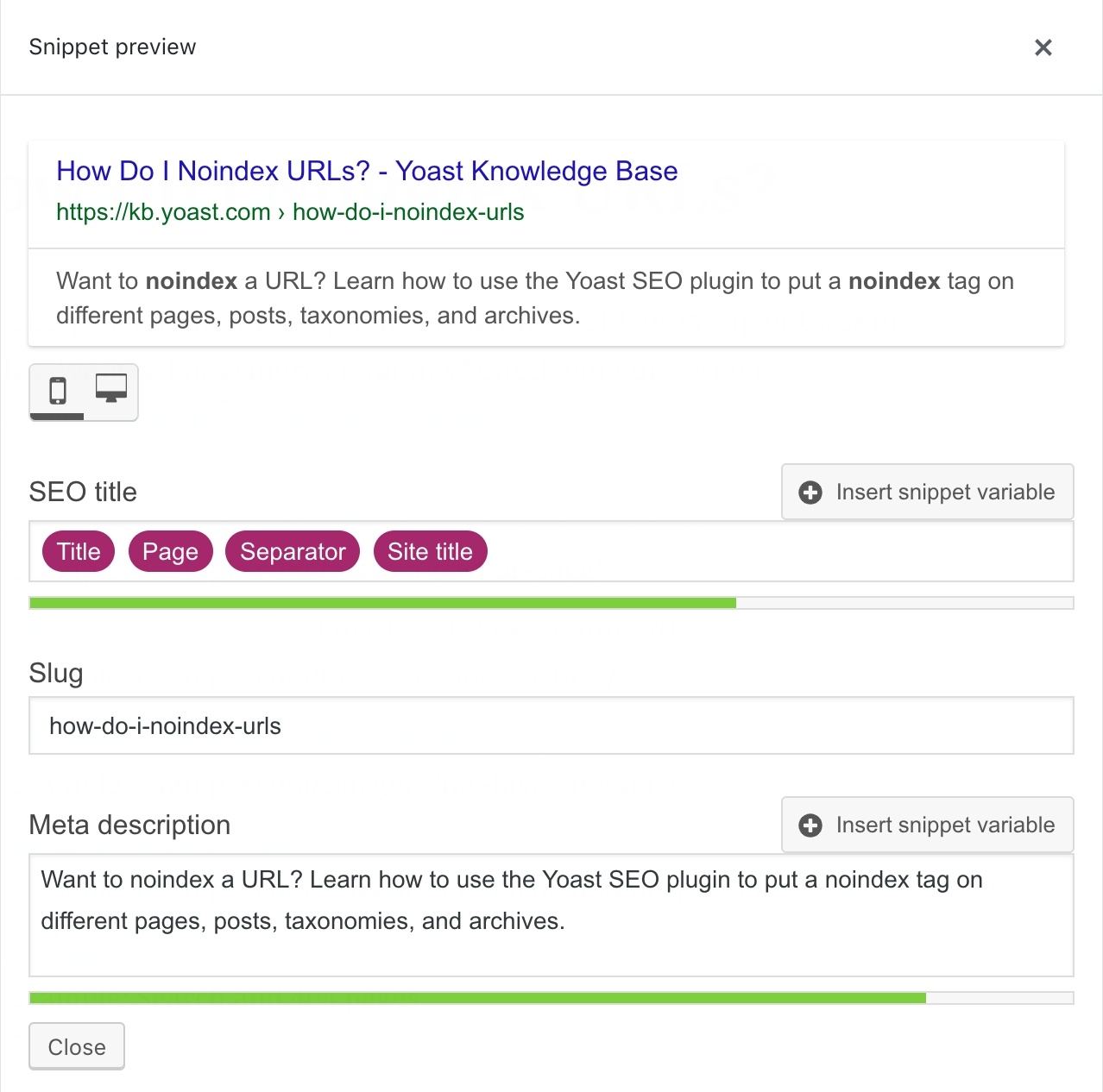 Yoast SEO will run a check on your content and see if you use your focus keyphrase in the right places. You should strive for an overall green smiley next to your focus keyphrase.